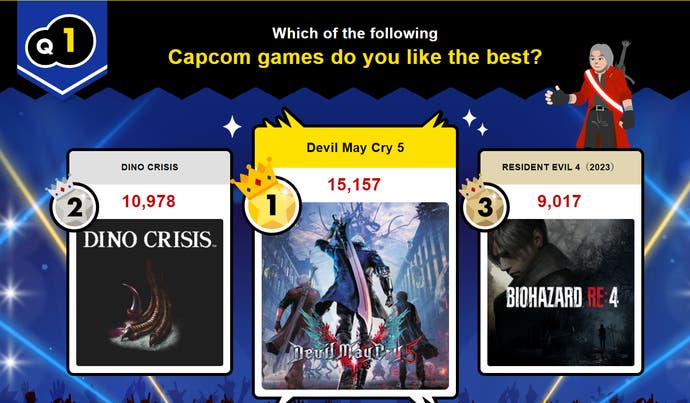 Quanto ao jogo favorito dos fãs, o vencedor foi Devil May Cry 5, seguido por Dino Crisis e Resident Evil 4 Remake.