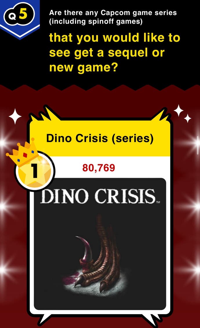 Uma das perguntas do questionário visava saber qual o jogo Capcom que deveria receber uma sequela ou nova entrada; o vencedor foi Dino Crisis, com 80.769 votos.
