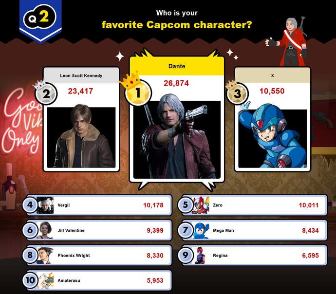 A Capcom também perguntou aos fãs qual era a sua personagem preferida, com Dante de Devil May Cry a ocupar o primeiro lugar do pódio. A medalha de prata foi para Leon Kennedy, de Resident Evil, e a de bronze para Mega Man.