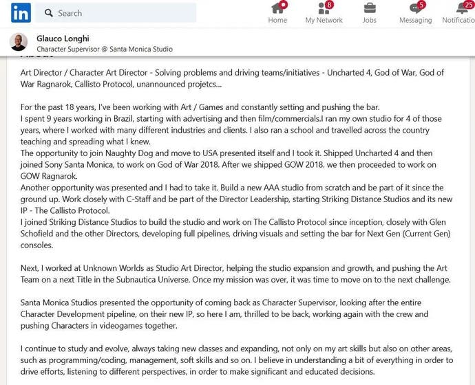 Num post escrito na sua página do LinkedIn, Longhi partilha algumas informações sobre a sua carreira, revelando que trabalhou na Naughty Dog (em Uncharted 4) e que depois juntou-se à Sony Santa Monica para trabalhar em God of War (2018) e God of War Ragnarok.