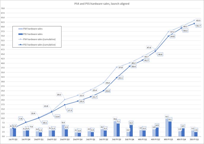 No Resetera, um utilizador partilhou um gráfico com as vendas da PS4 e PS5 alinhadas; como podemos ver, o percurso de ambos os dispositivos tem sido semelhante e a diferença entre eles não é muito abrupta, mas a PS5 continua abaixo da PS4.