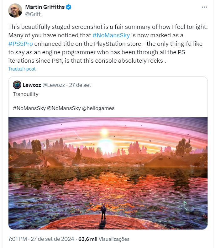 "Este belo screenshot é um resumo justo de como me sinto esta noite. Muitos de vós já repararam que No Man's Sky está agora marcado como um título melhorado na PS5 Pro na PlayStation Store – a única coisa que gostaria de dizer como programador de motores que passou por todas as iterações da PlayStation desde a PS1, é que esta consola é absolutamente espetacular.", diz ele no post que colocámos abaixo.