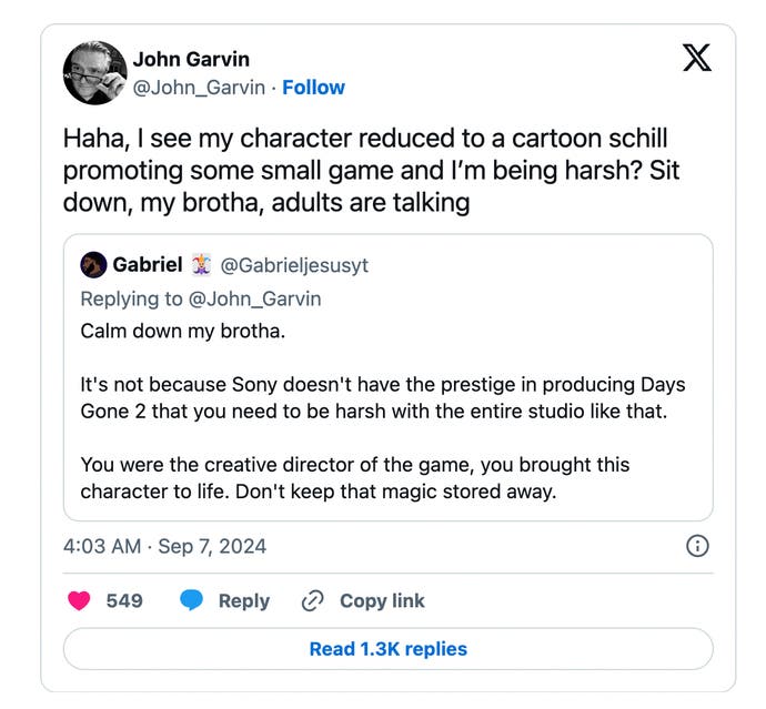 Através da rede social X, Garvin comentou que está triste por ver que a Sony está a usar uma personagem cancelada para promover um “jogo pequeno”, mas também critica a Bend Studio.
