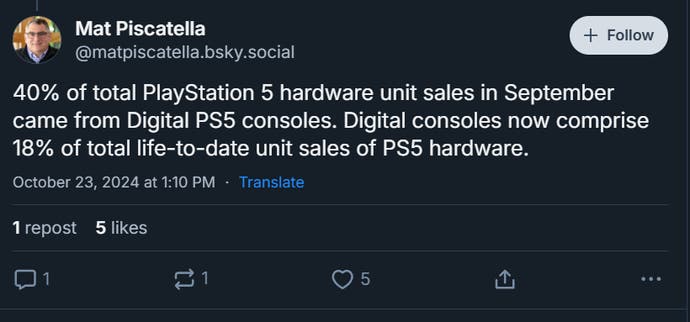 Os dados divulgados pela Circana sobre as vendas dos consolas PS5 revelam uma tendência: 82% das vendas totais ao longo da vida do console são da versão com leitor de discos. Isto mostra a preferência dos jogadores por uma opção que permita a utilização de suportes físicos, mesmo com a progressiva adesão ao PS5 digital, que representava 40% das vendas de hardware em setembro de 2024.
