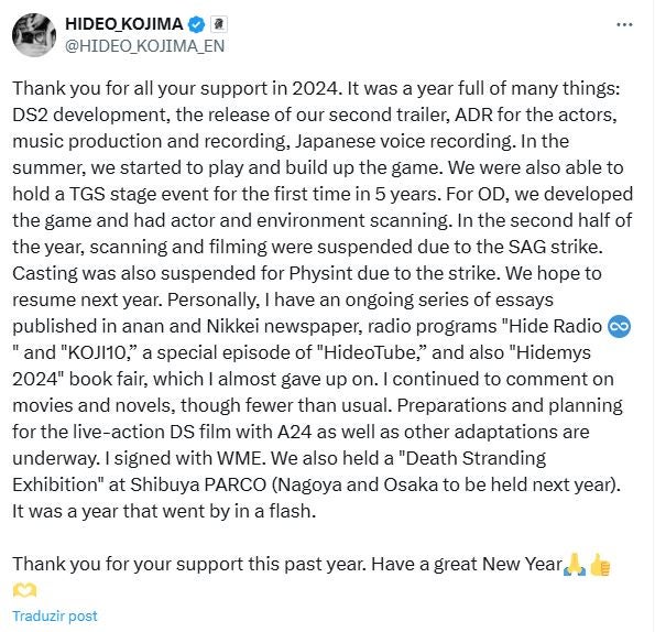 "Obrigado por todo o apoio em 2024. Foi um ano cheio de muitas coisas: desenvolvimento de DS2, lançamento do nosso segundo trailer, ADR para os atores, produção e gravação musical, gravação da dobragem em japonês. No verão, começamos a jogar e a construir o jogo. Conseguimos também participar num evento TGS pela primeira vez em 5 anos.", afirma Kojima.