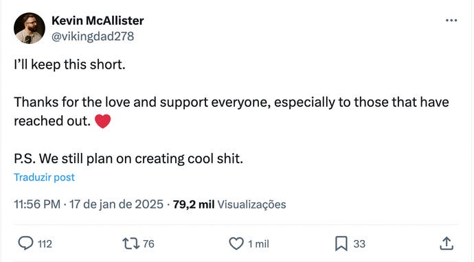 “Vou deixar isto breve. Obrigado a todos por todo o amor e apoio, especialmente os que entraram em contato. PS: planeamos continuar a criar coisas mesmo fixes,” escreveu Kevin McAllister, gestor de comunidade na Sony Bend, em nome da produtora, na rede social X.