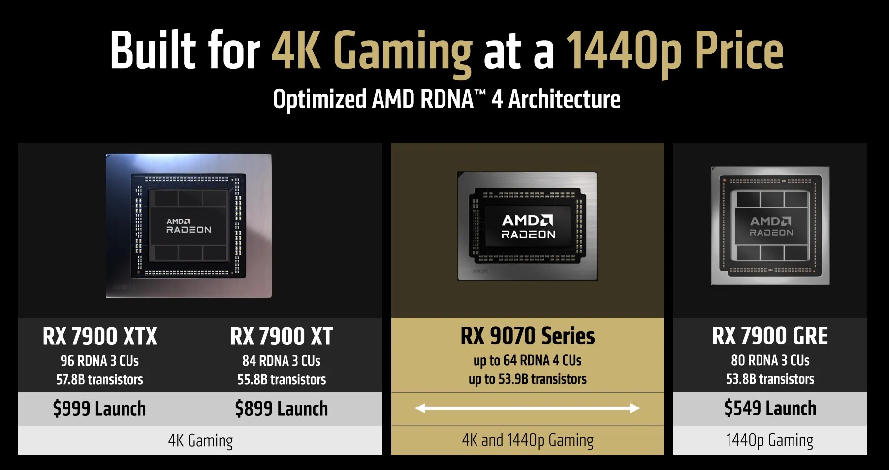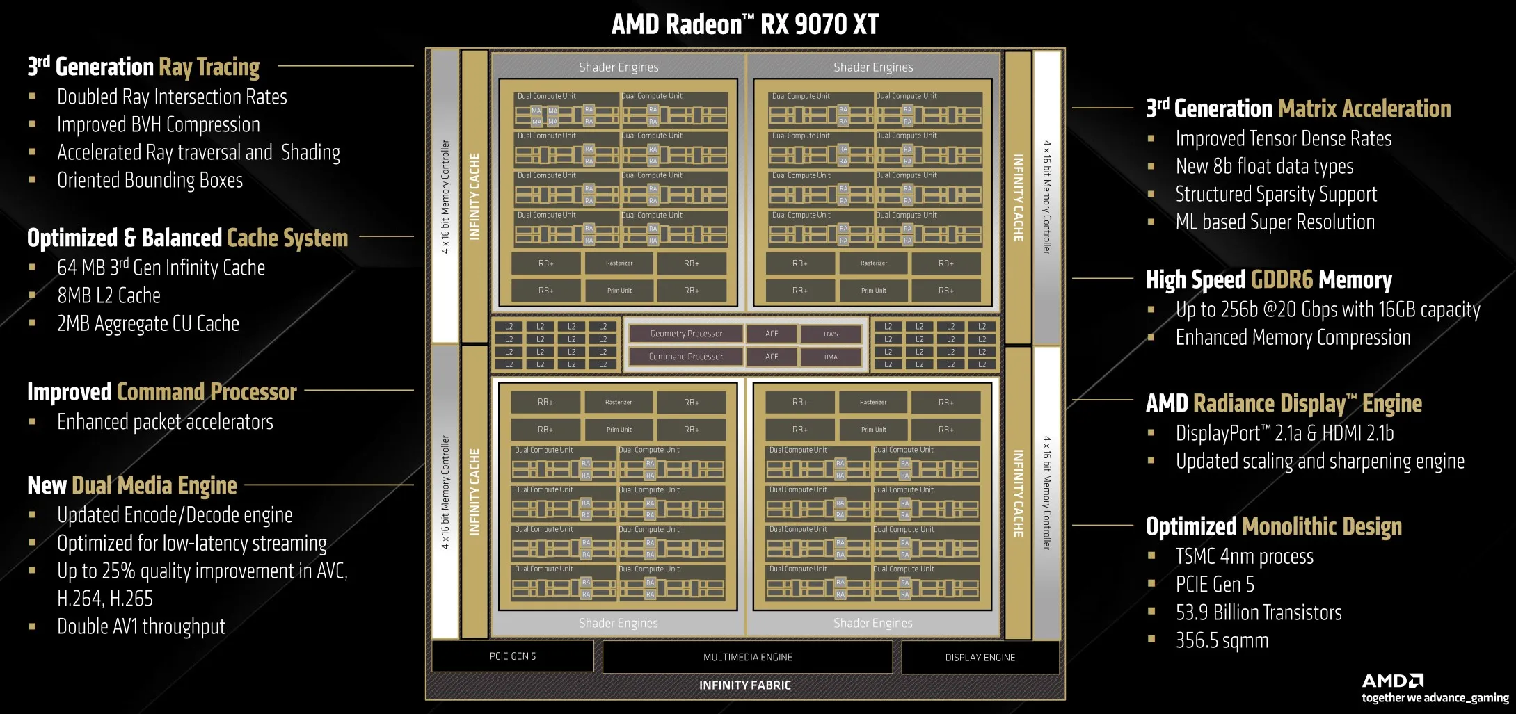Com 16 GB de memória GDDR6, as novas placas trazem melhorias consideráveis no desempenho. A RX 9070 XT destaca-se por superar a RX 6900 XT em até 51% em jogos 4K. O foco no ray tracing foi reforçado com aceleradores de terceira geração, enquanto os aceleradores de IA de segunda geração permitem uma utilização mais eficiente de tecnologias como a FidelityFX Super Resolution 4 (FSR 4).