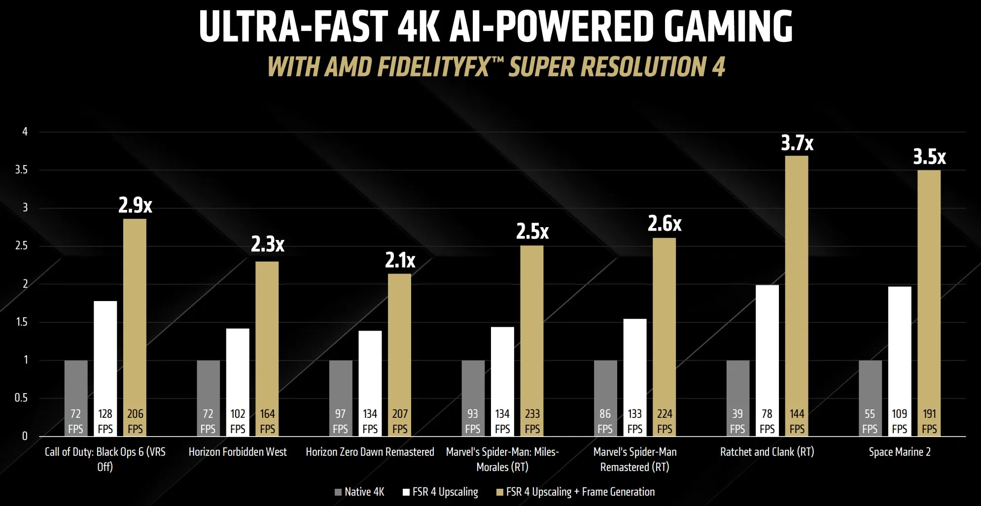 O FSR 4 utiliza hardware de IA dedicado para melhorar a qualidade de imagem e o desempenho em jogos compatíveis, o que o torna uma resposta direta ao DLSS 4 da Nvidia. Além disso, a AMD destacou o motor multimédia melhorado, capaz de suportar codecs modernos e oferecer melhores funcionalidades aos criadores de conteúdos.