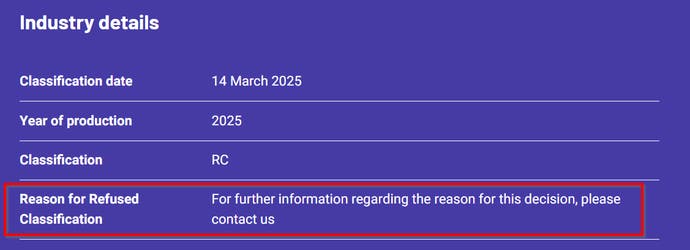 "A Classificação Recusada (RC) refere-se a filmes, jogos de computador e publicações que não podem ser vendidos, alugados, publicitados ou importados legalmente na Austrália. O material classificado como RC contém conteúdo que está fora dos padrões geralmente aceites pela comunidade e excede o que pode ser incluído nas classificações R 18+ e X 18+."