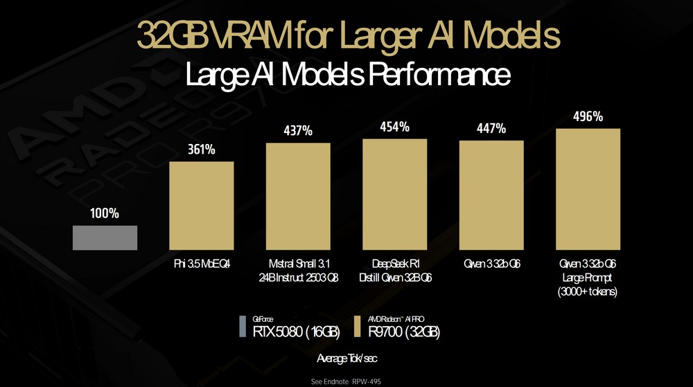 Como mencionado, o grande trunfo da R9700 é a capacidade de 32 GB de VRAM GDDR6, que acomoda Grandes Modelos de Linguagem (LLMs) de tamanho mais avantajado. A AMD comparou o lançamento à sua antiga placa profissional avançada, a Radeon PRO W7800, e à NVIDIA GeForce RTX 5080, mostrando dois pontos de vantagem importantes da novidade.