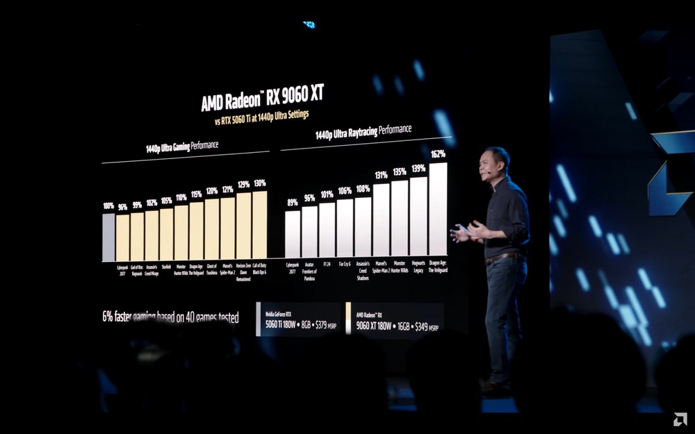 A AMD está muito confiante na RX 9060 XT de 16 GB, e afirma que a solução seria em média 6% mais rápida que a RTX 5060 Ti de 8 GB, com um trunfo importante: o preço. Enquanto a GPU da NVIDIA sai por a partir de US$ 379 (~R$ 2.150), a Radeon de entrada com o dobro de VRAM custará US$ 349 (~R$ 1.985), entregando "15% mais performance por dólar".