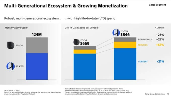 Em 2024, a empresa indicou que o número de utilizadores mensais ativos nas duas consolas rondava os 49 milhões, o que representava uma divisão igual entre as duas plataformas. Um ano mais tarde, embora os números exatos não tenham sido revelados, os gráficos apresentados pela SIE mostram claramente que a PS5 é responsável por uma maior percentagem da atividade mensal dos jogadores. Atualmente, o total combinado de utilizadores ativos nos dois consoles é de 124 milhões, contra 97 milhões no ano anterior.